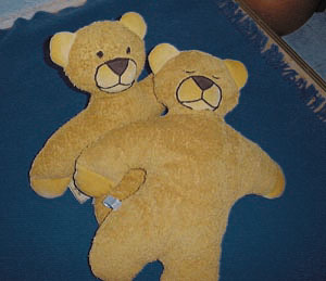 Dieser weiche, anschmiegsame Geselle hat zwei Gesichter und ist mit seinen 46 cm so groß wie ein Säugling. Liebevolle Details können aktivieren, aber auch Geborgenheit und Ruhe vermitteln. Der Körper ist aus weichem Baumwollfrottee; Ohren, Nase und Pfoten aus Nickistoff gefertigt.